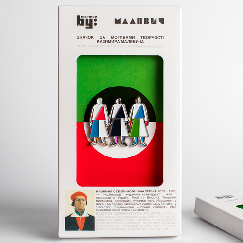 Этот яркий значок вдохновлен легендарной работой Казимира Малевича "Девушки в поле" - произведением, символизирующим гармонию человека и пространства, сочетание формы и цвета. Стилизованные фигуры на значке передают атмосферу супрематизма — движению, которое перевернуло представление об искусстве ХХ века.
